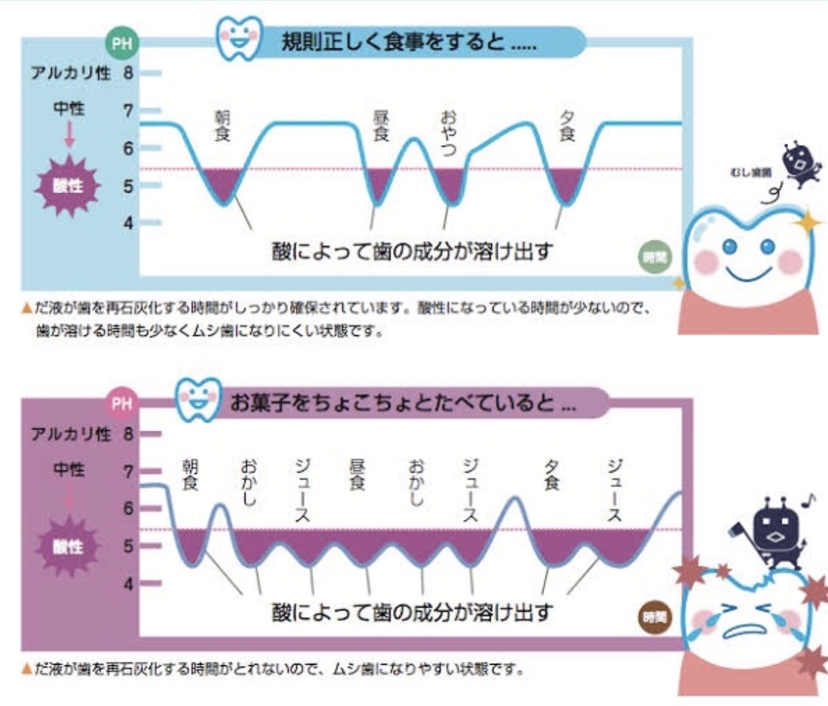この下のグラフのようにダラダラ食べてしまうとお口の中では歯が溶けている状況が続いてしまっているので、さらに虫歯になりやすくなります。